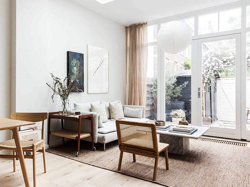 Associez votre intérieur clair à des meubles plus audacieux (table basse en fer forgé noir, avec un plateau en bois foncé brut devant un canapé en cuir beige, par exemple). Et pensez aux tapis! Ils créent une atmosphère chaleureuse et relaxante.